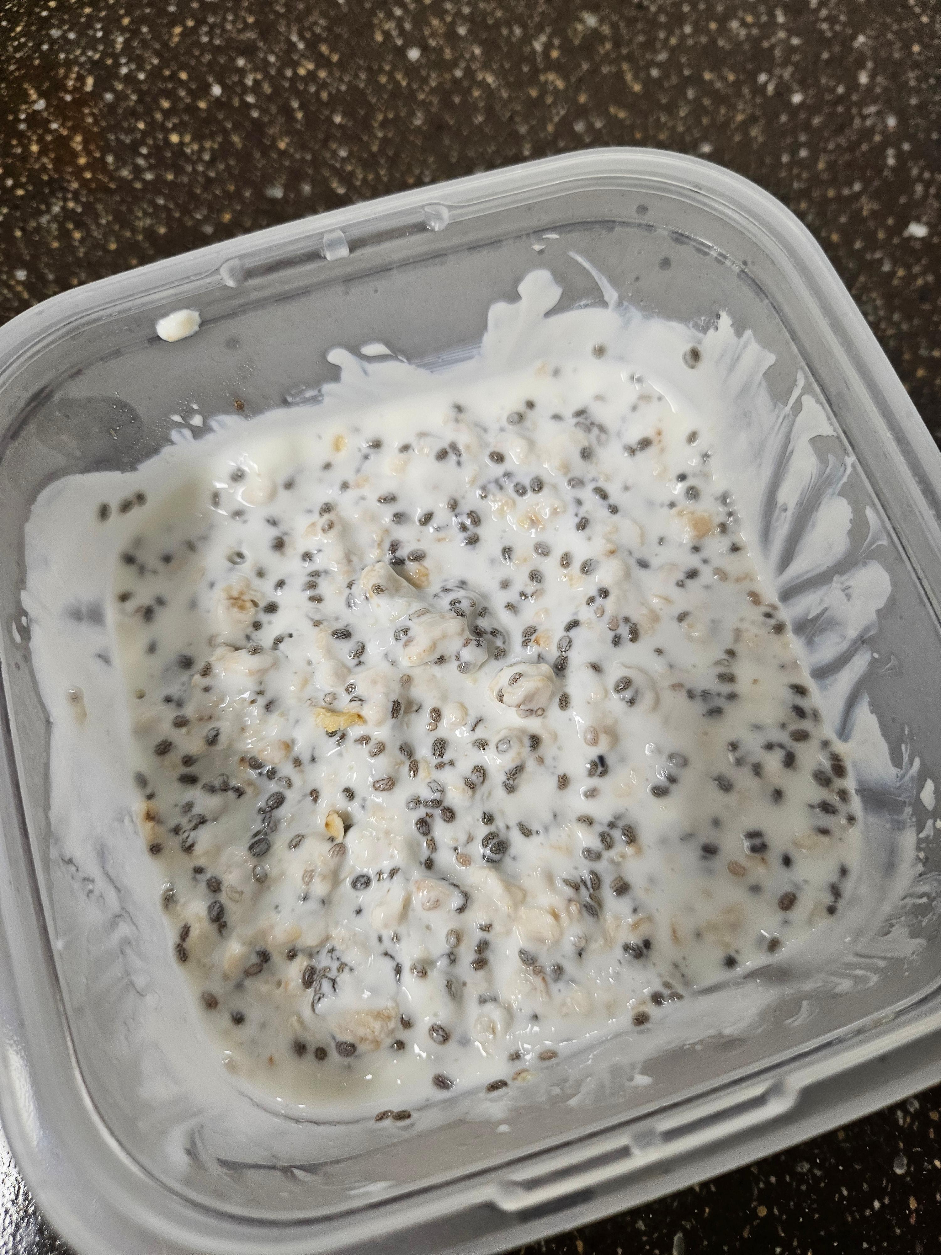 - 밀폐용기에 오트밀, 치아씨드, 요거트, 두유(또는 우유)를 넣고 섞습니다.